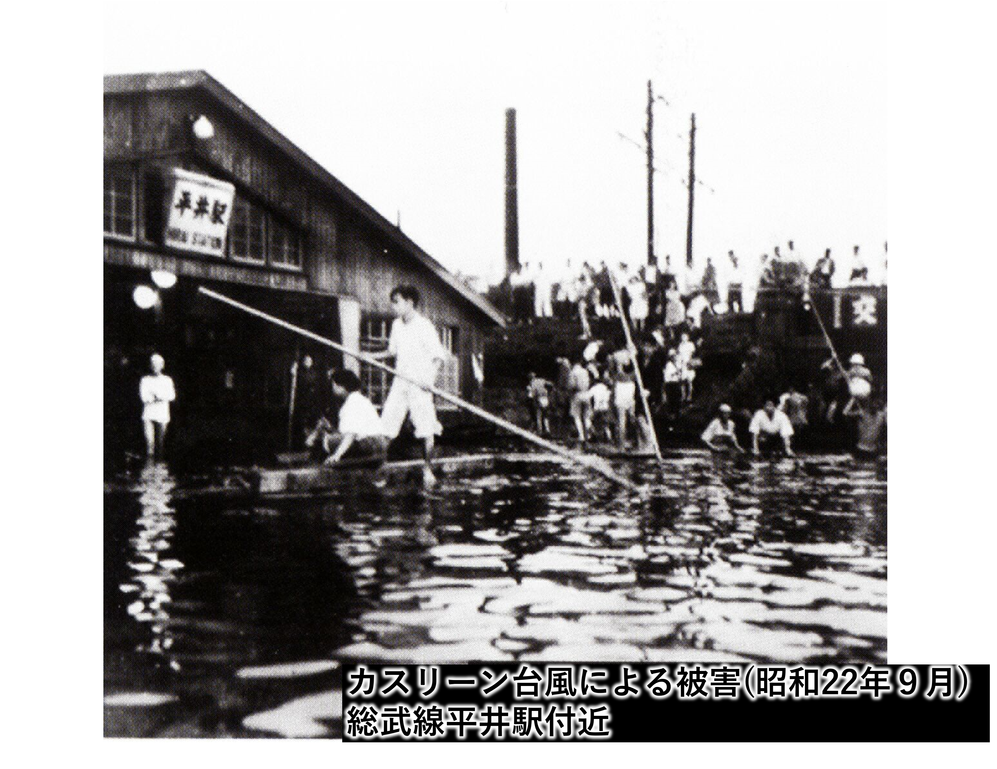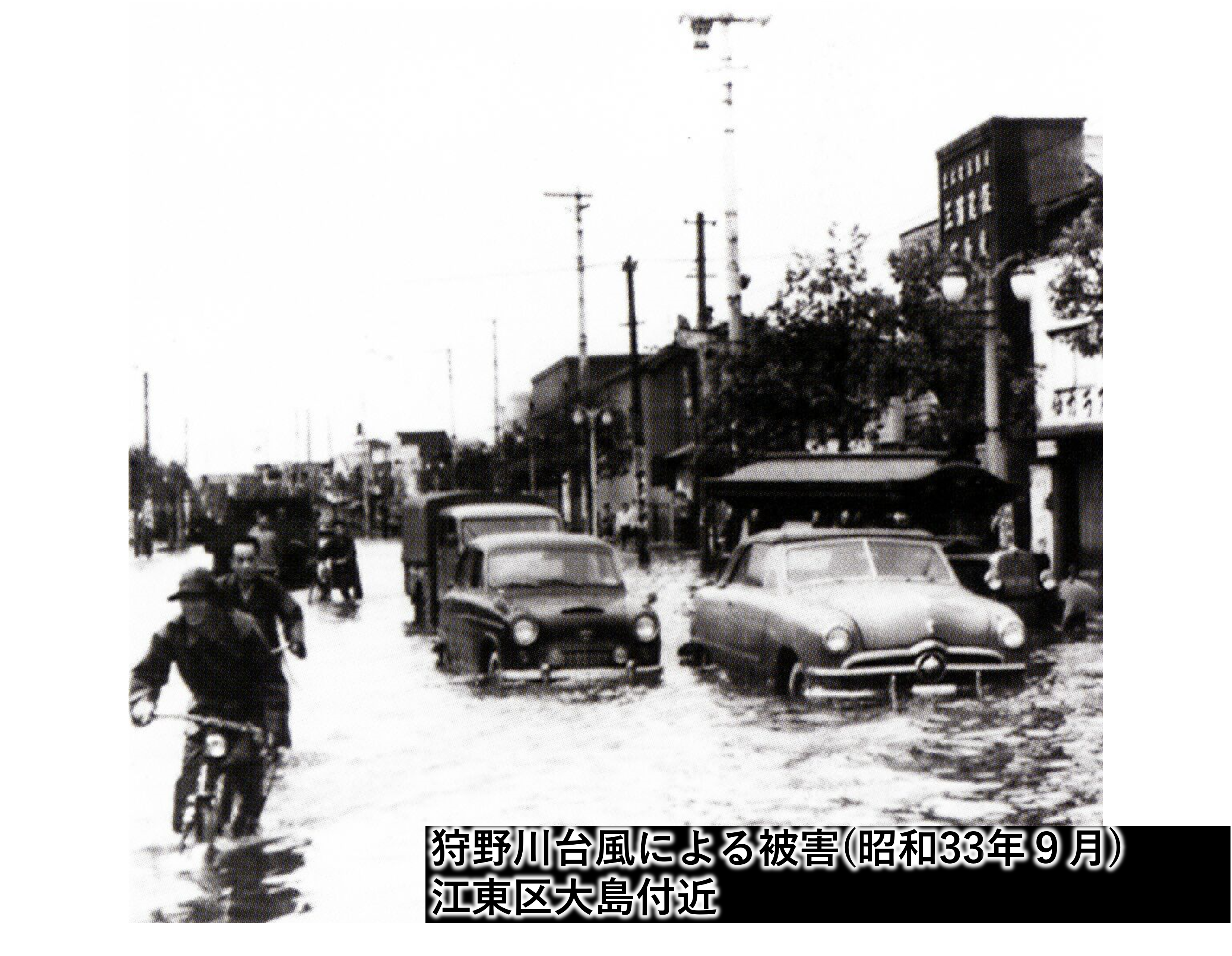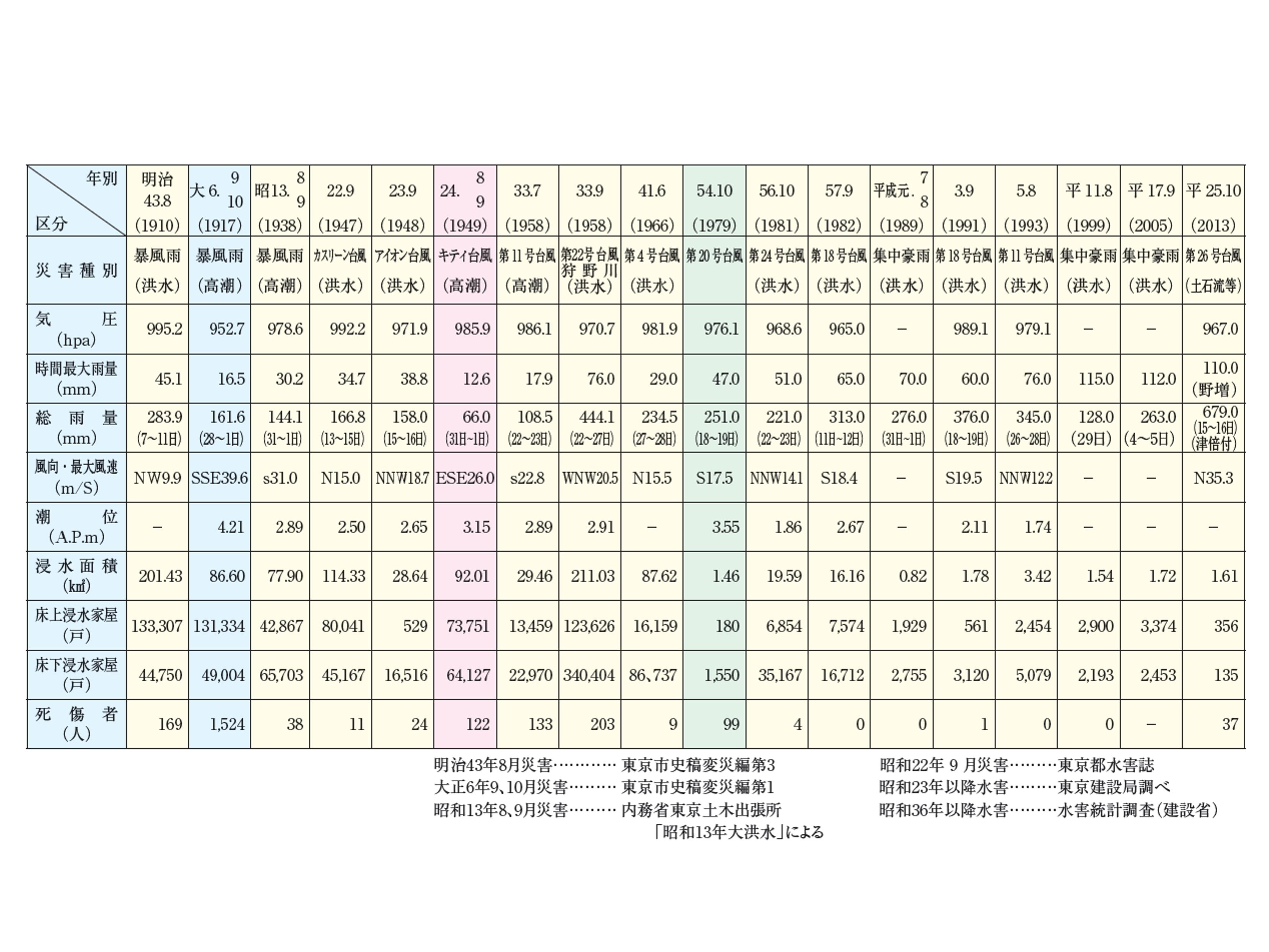 これまで、荒川放水路(現、荒川)開削の契機となった明治40年、43年の大雨や、既往最大の高潮(A.P.+4.2m)を記録した大正6年の台風、キティ台風(昭和24年)、狩野川台風(昭和33年)等、多くの水害に見舞われてきました。