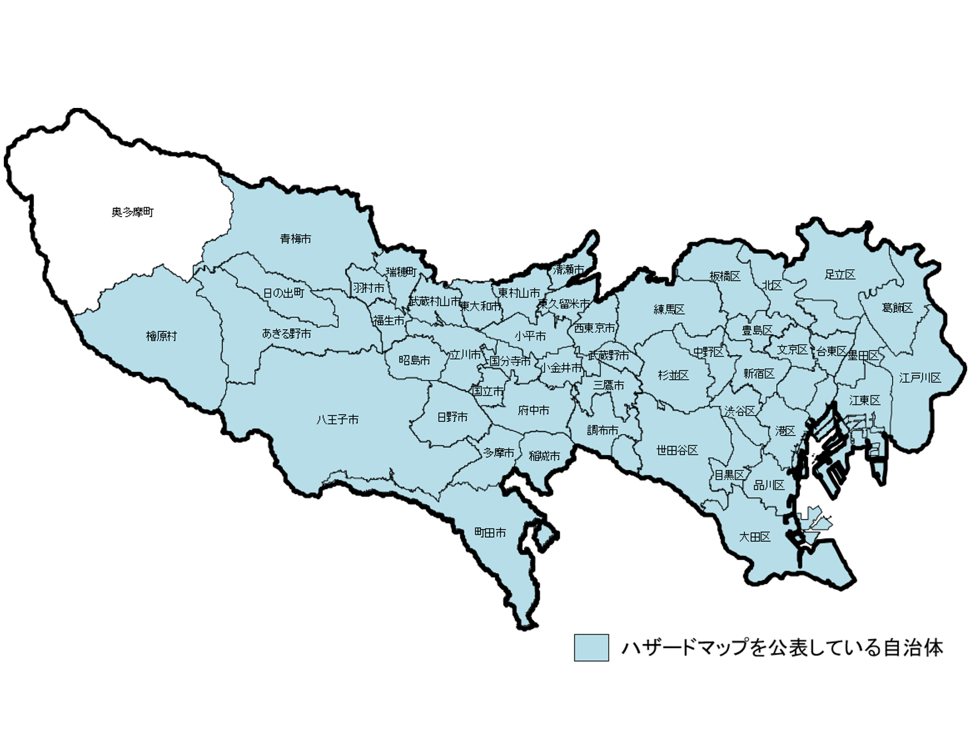 洪水ハザードマップとは、水防法第15条に基づき、避難施設や避難場所、避難経路等に関する事項を定めるものとして、東京都又は国土交通省の各河川事務所が公表している洪水浸水想定区域図や都市型水害対策連絡会が公表している浸水予想区域図を基に、東京都内の各区市町村が作成・公表しています。