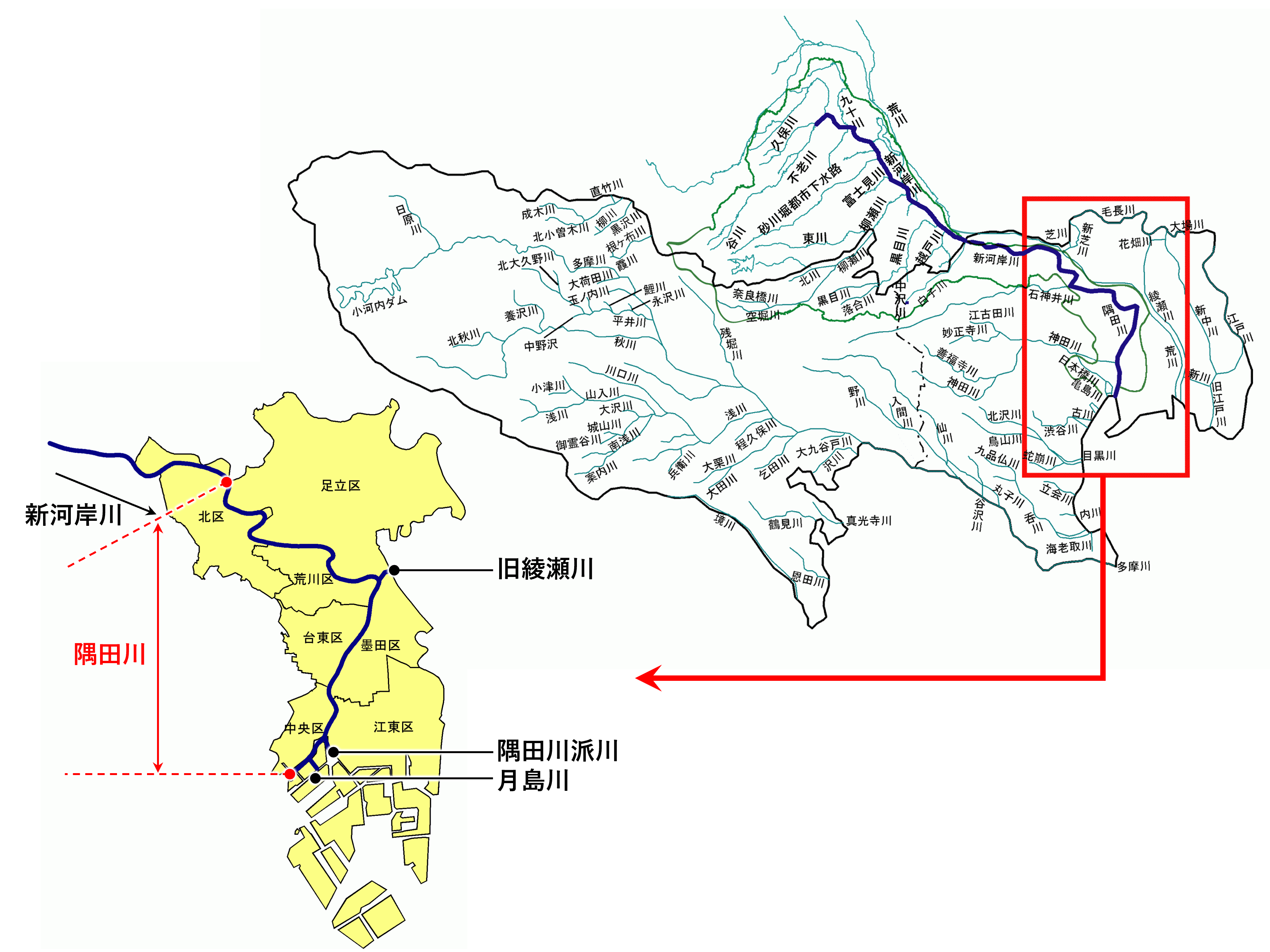 隅田川は、北区にある岩淵水門で荒川から分派した後、新河岸川、石神井川、神田川等を合流させ、東京の東部低地帯の沿川7区(北区、足立区、荒川区、台東区、墨田区、中央区、江東区)を流下し、東京湾へ注ぐ荒川水系の一級河川です。
