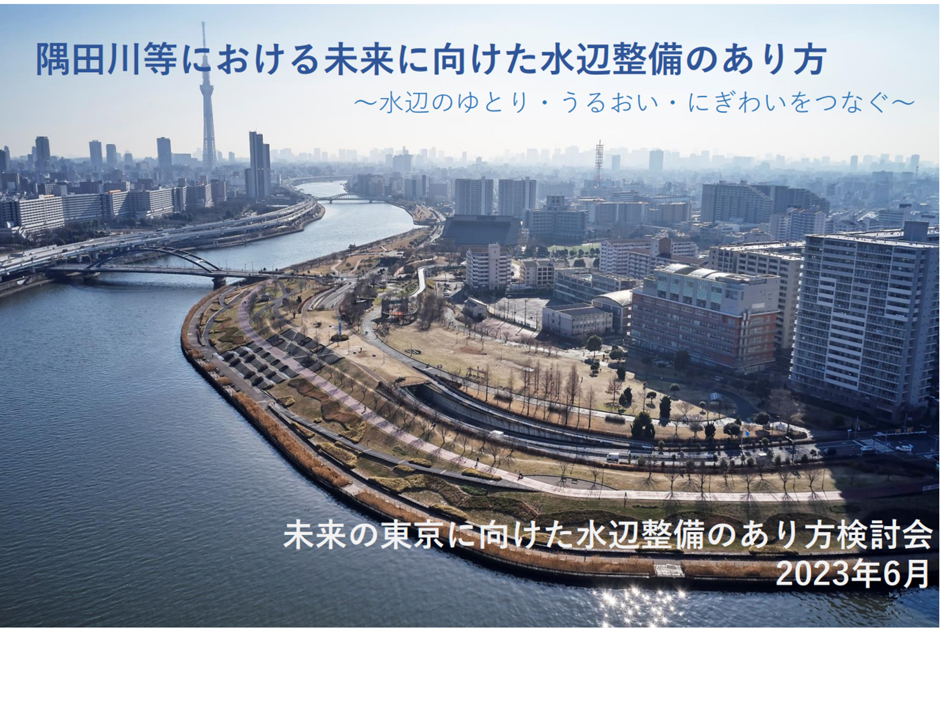 2023年6月、東京都は「隅田川等における未来に向けた水辺整備のあり方」を公表しました。これは、これまでの取組やポストコロナを見据えた社会情勢の変化等を踏まえ、水辺のオープンスペースが持つ『ゆとりと潤い』を活かした今後の水辺整備のあり方(方向性)についてまとめたものです。