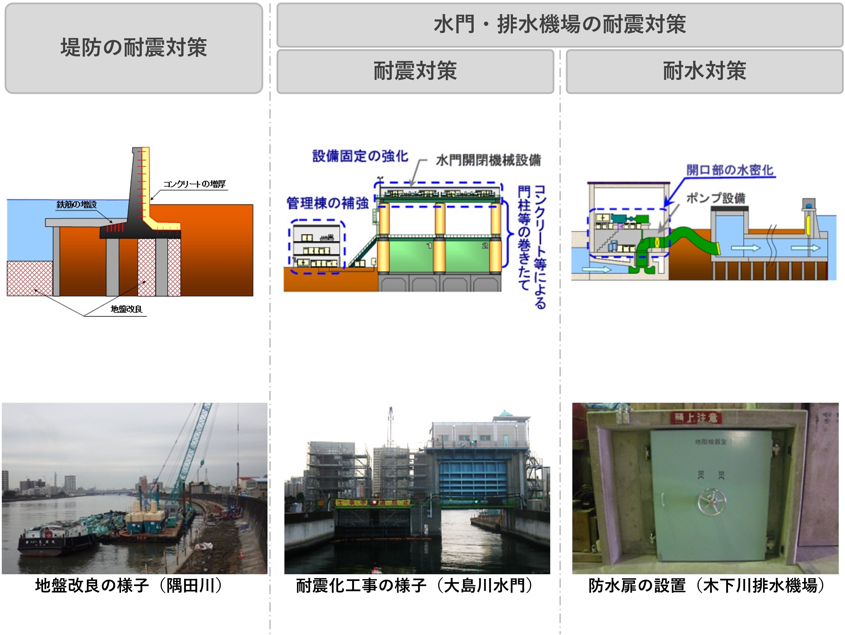 さらに、平成23年3月の東日本大震災を受け、将来にわたって考えられる最大級の強さを持つ地震に対応するため、平成24年12月に「東部低地帯の河川施設整備計画」を策定しました。令和3年12月には、「東部低地帯の河川施設整備計画(第二期)」を策定し、防潮堤や水門等の耐震・耐水対策を実施しています。