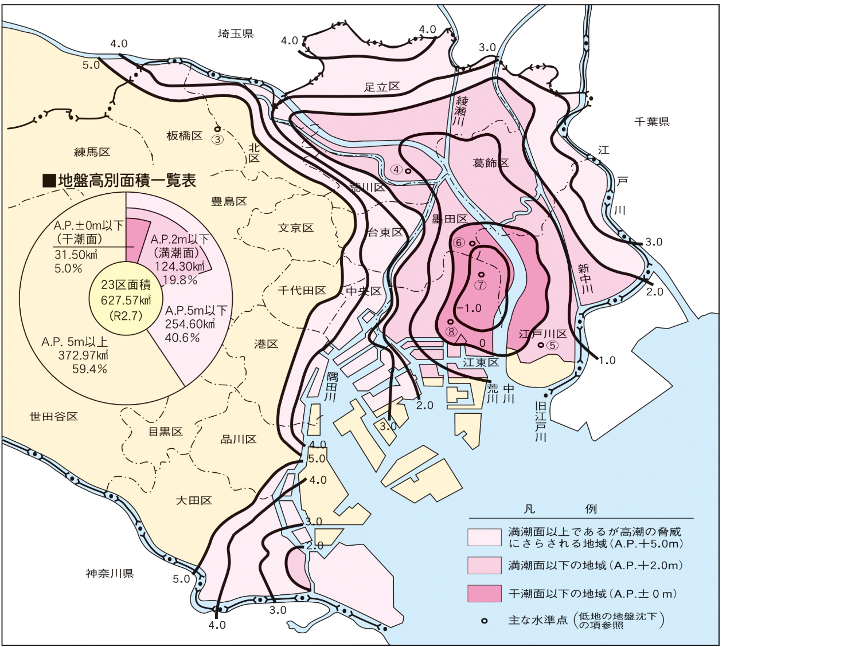 隅田川沿川は、高潮の脅威にさらされる地域(A.P.+5.1m以下)であり、右岸側(隅田川の西側)は概ね満潮面以上ですが、左岸側(隅田川の東側)はほとんどが満潮面以下(A.P.+2.0m以下)となっています。