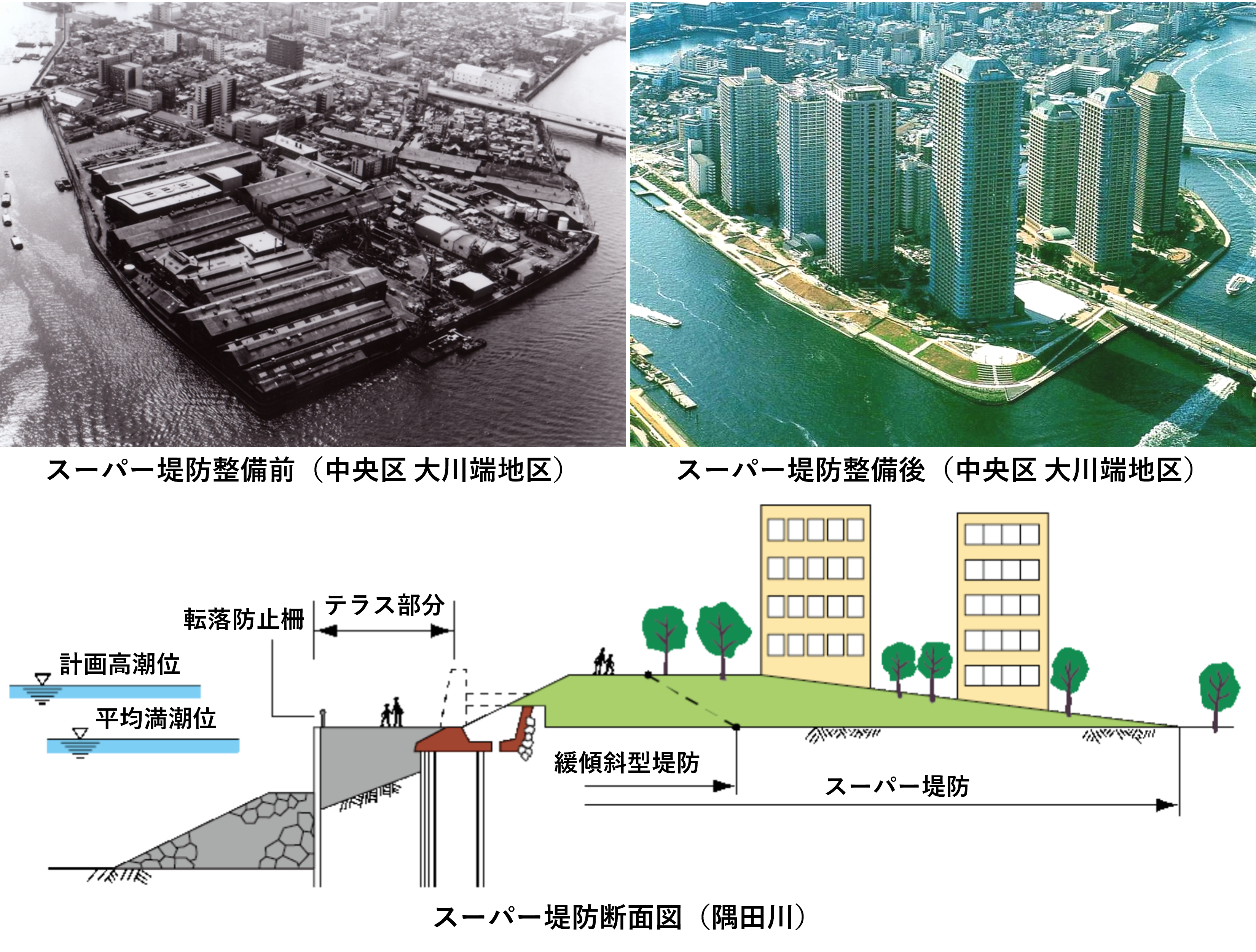 1980 年代、下水道整備等による水質改善と合わせてコンクリートによる直立の防潮堤を改築し、盛土による堤防を整備するスーパー堤防やテラス等の整備を進めたことで、再び水辺と街がつながっていきました。