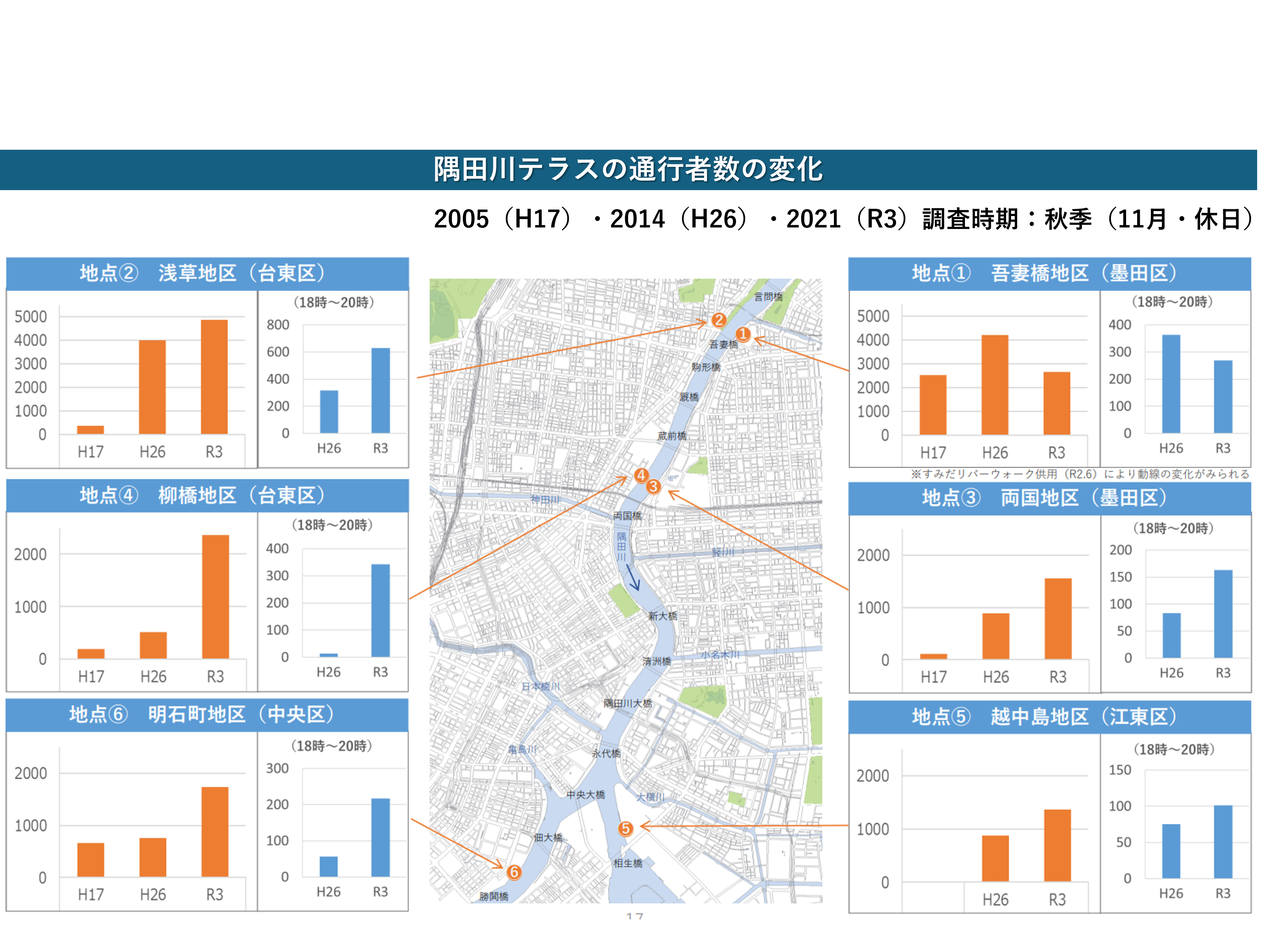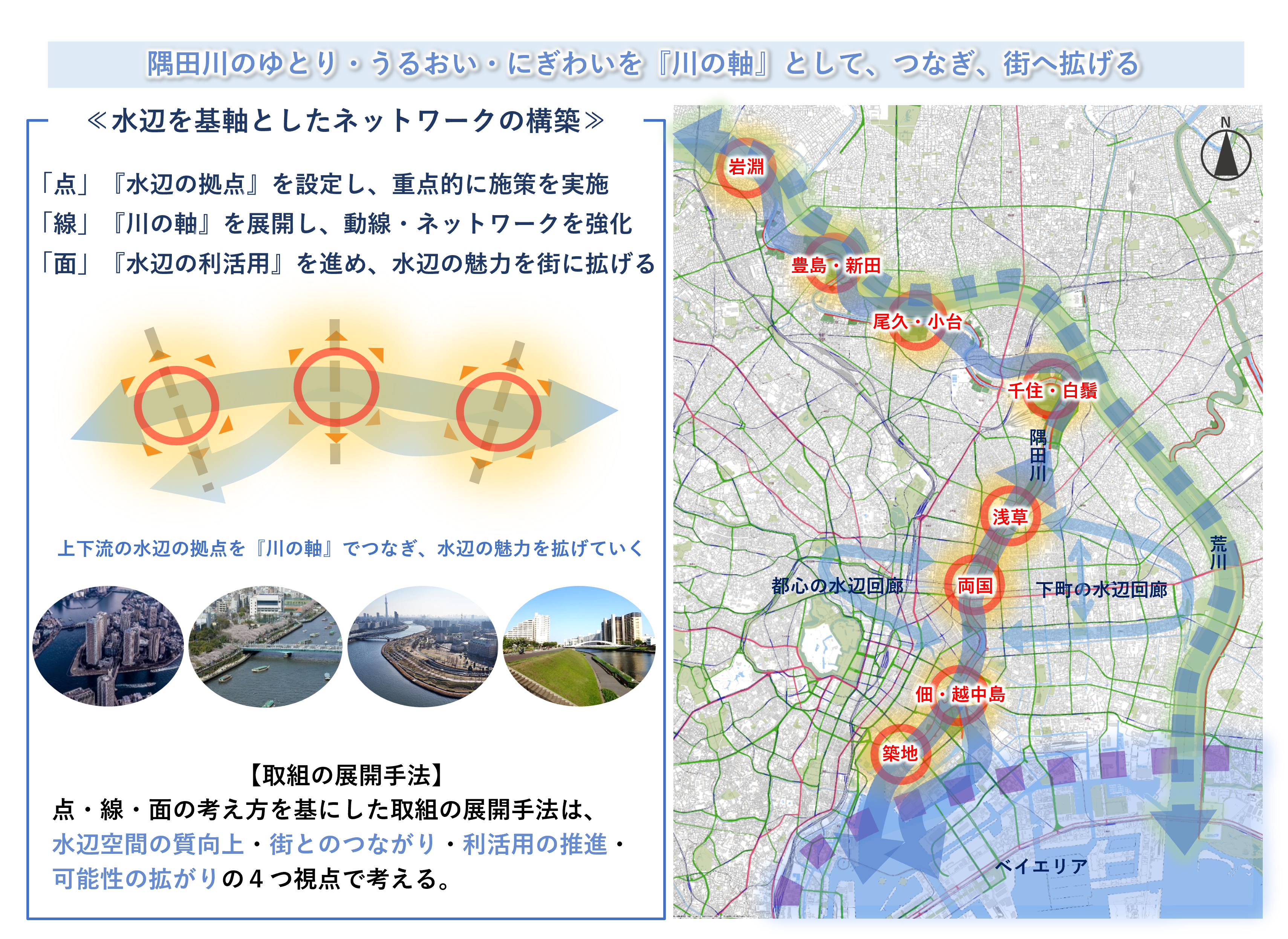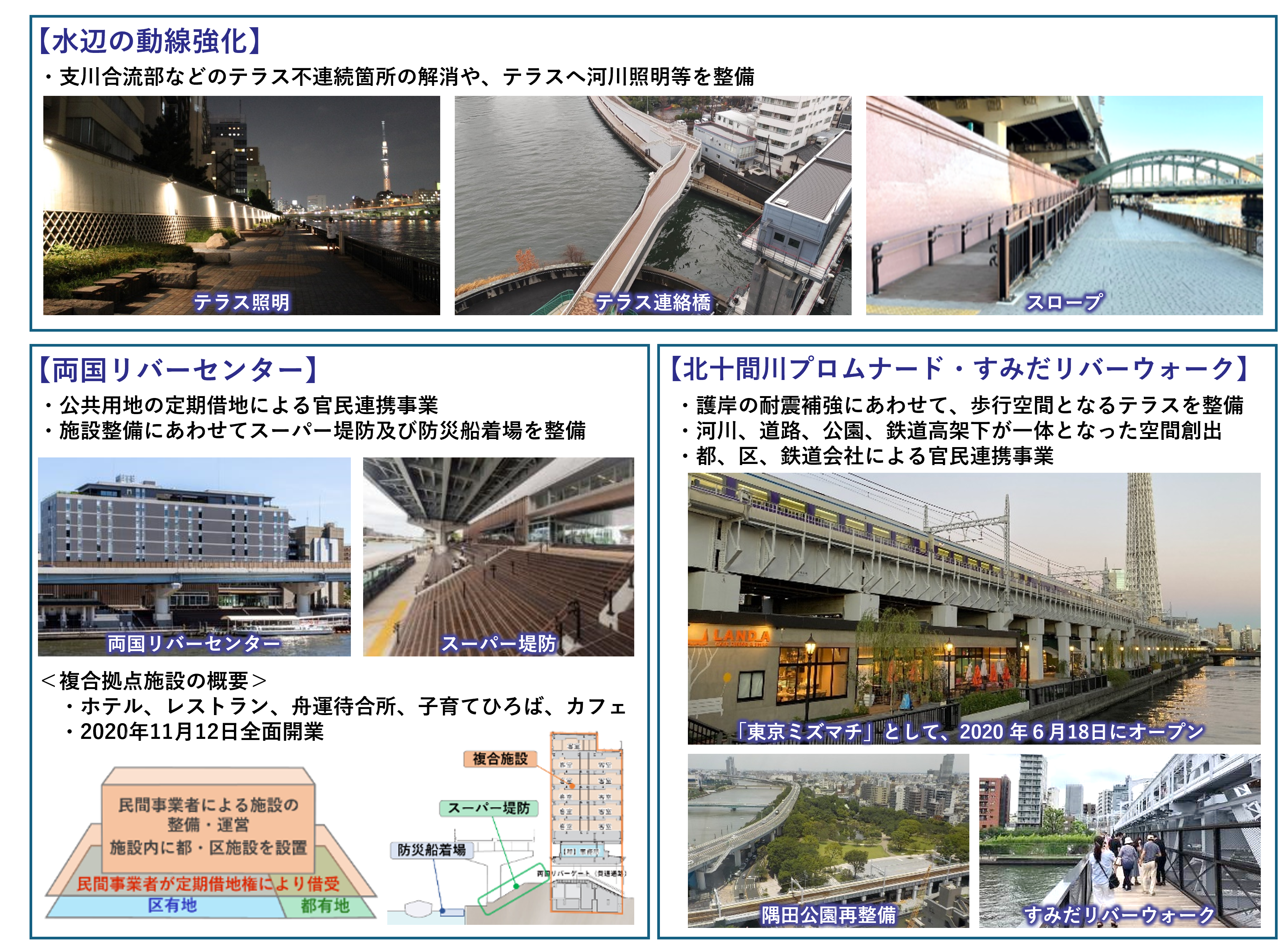 「隅田川等における新たな水辺整備のあり方」を踏まえ、「水辺の魅力を活かした東京の顔づくり」として、水辺の動線強化、両国リバーセンターの整備にあわせたスーパー堤防及び防災船着場を整備、都、区、鉄道会社と連携した、北十間川プロムナード(東京ミズマチ)・すみだリバーウォーク等の取組を進めて参りました。