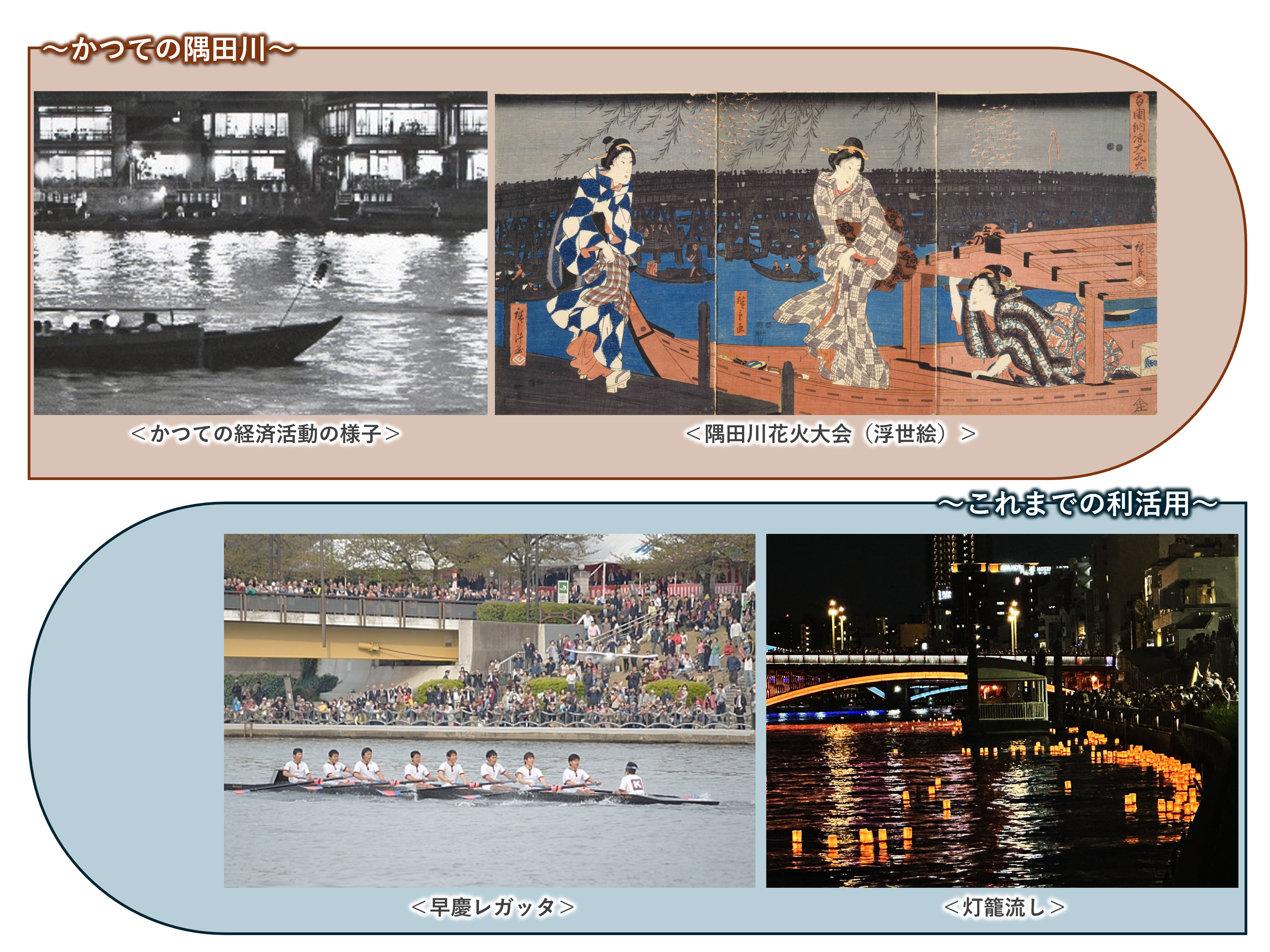 かつて、隅田川を中心とした水辺空間は、東京の東部低地帯を縦横に流れる河川や運河で構成され、水の都と呼ばれていました。