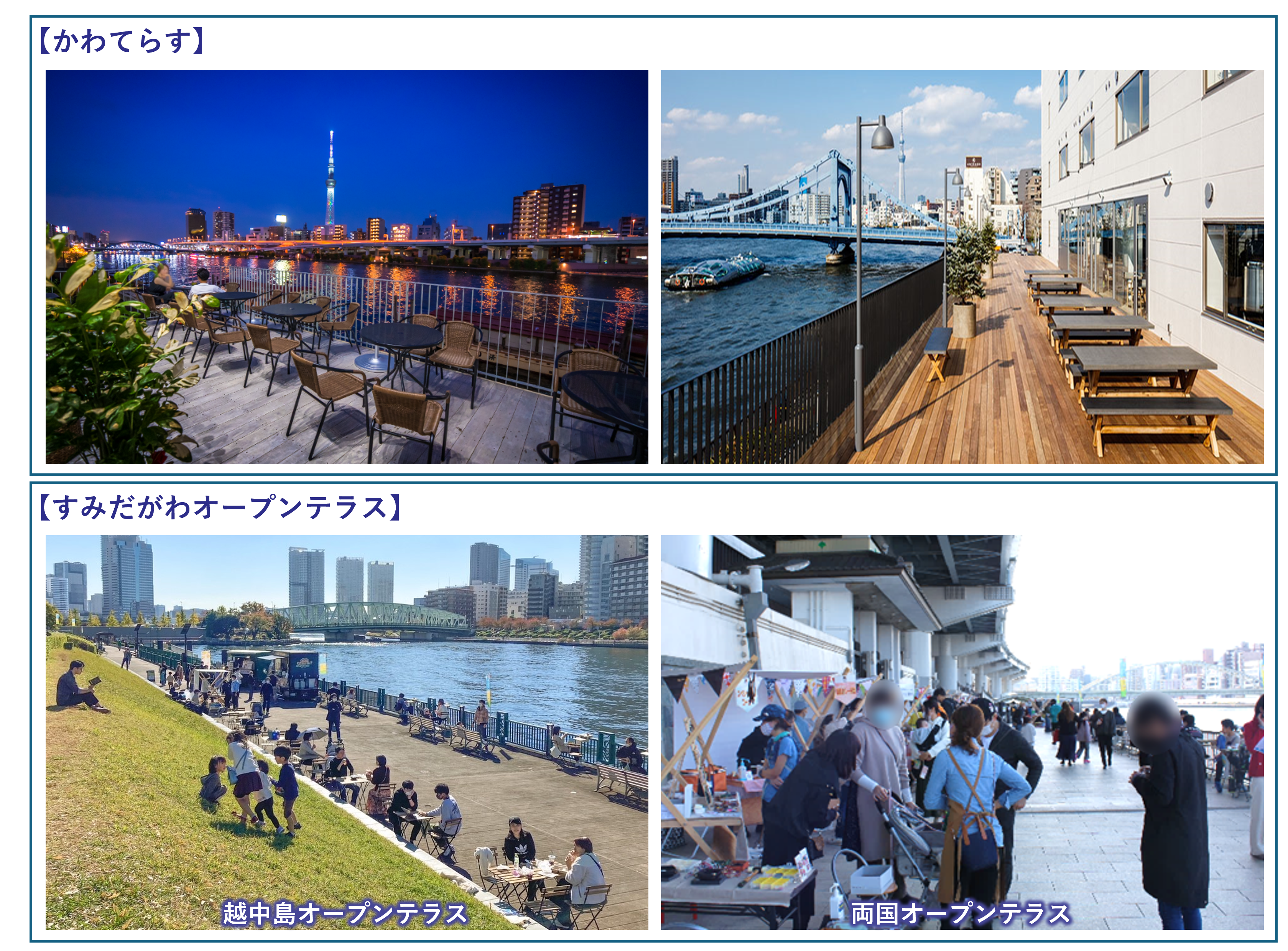 また、隅田川テラス等の恒常的な利活用に向けて、水辺を楽しめる空間とマルシェやキッチンカー等のコンテンツを用意し、身近なオープンスペースとしてテラスを利活用する取組を進めています。