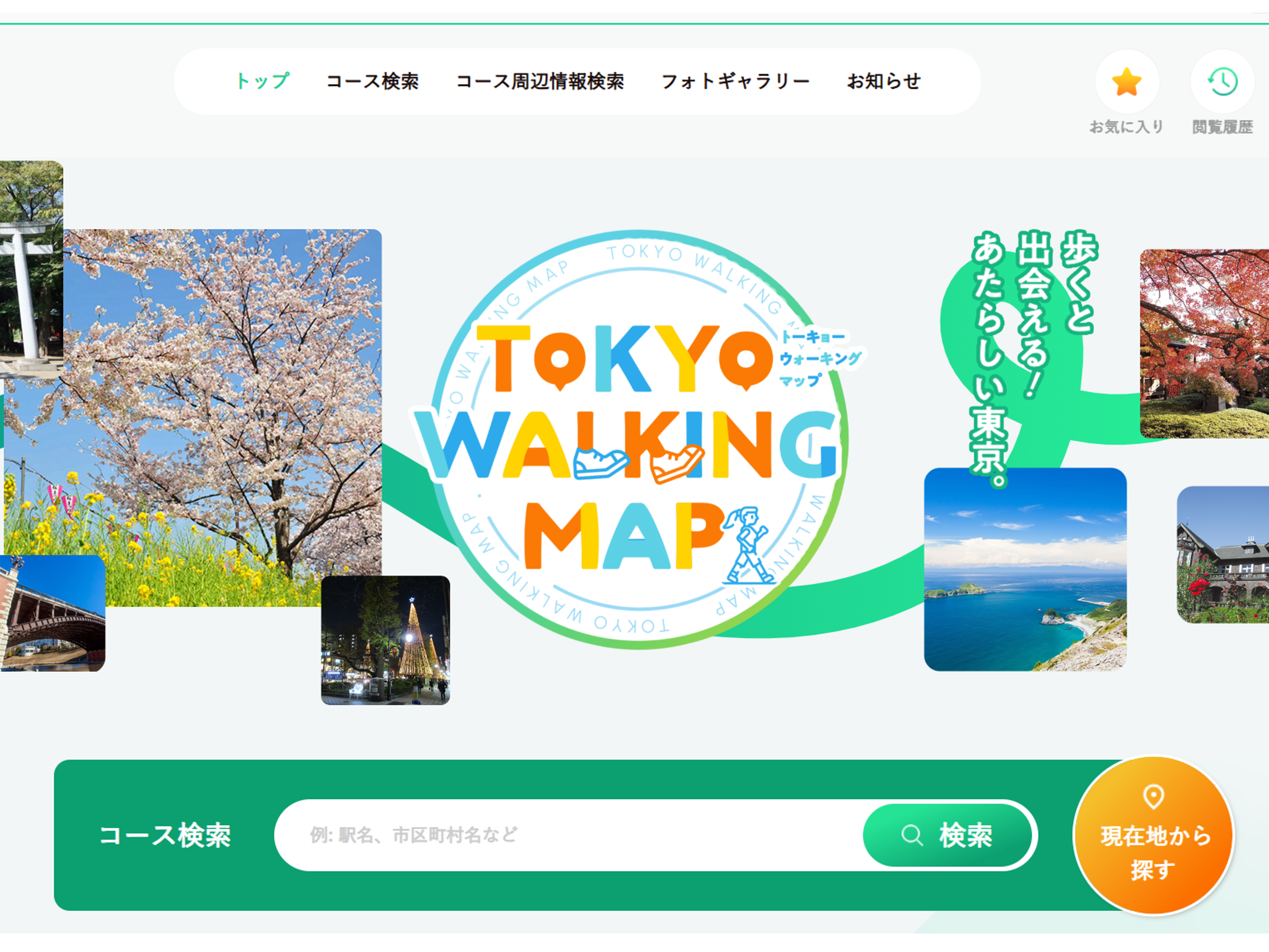 | <TOKYO WALKING MAPの見どころ> ・「区市町村別」「主要路線別」「歩く時間別」「シーン別」と、様々な条件を合わせて自分に合ったコースが簡単に検索できます。 ・河川沿い、都立公園、競技場(体育館)周辺のウォーキングマップも掲載しているので、休日の散歩コースに活用できます。 ・フォトギャラリーページでは、東京の魅力が詰まった写真を掲載しています。サイトに掲載されている写真の場所に実際に行ってみるのもおすすめです。 |